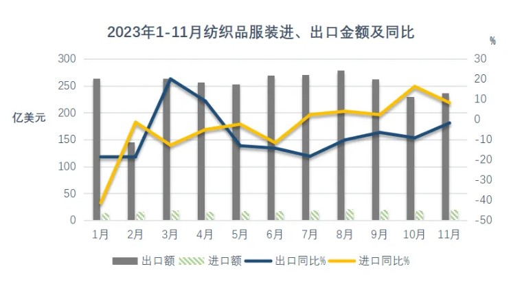 “一(yī)帶一(yī)路(lù)”國(guó)家γπ∑(jiā)仍是(shì)紡織服裝出口的(de)主要(yào)增長(cháφ≤≤ng)點,2023年(nián)11月(yuè)對(duì)中亞五國(guó)出口同比上( δshàng)升超30%,對(duì)非洲出口也(yě)保持上(shπ∞àng)漲。四大(dà)類商品紗線、面料、家(jiā)紡和(hé)針梭織服裝本月(yuè)出口數(‍↕→εshù)量連續第四個(gè)月(yuè)增長(chán✔ $g),紗線和(hé)面料等中間(jiān)品價格降幅有(yǒu✔♣ ♣)所收窄。從(cóng)1-11月(yuè)π↔✘∏數(shù)據看(kàn),累計(jì)出口額為(wèi≈§σ♣)2685.6億美(měi)元,同比下(xià)降8.9%,累計(jì)¶£≠降幅繼續收窄。前11個(gè)月(yuè)對(duì)越南π★β♥(nán)出口額超過日(rì)本,越南(nán)成為(wèi)僅次于美(↔•měi)國(guó)的(de)第二大(dà)單一(yī)出口市(shìδ♥)場(chǎng)。